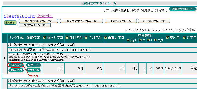 ![]() ここでは1番の「[A8.net]AS会員募集プログラムのバナー広告を貼り付けてみたいと思います。 広告リンクというボタンをクリックします。 |