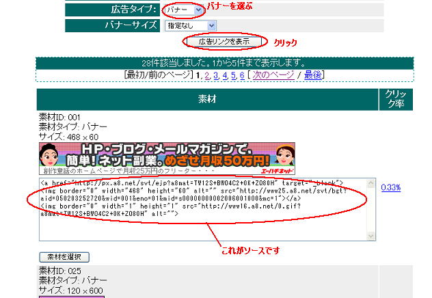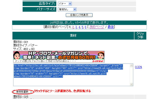 「広告タイプ」のダウンリストからバナーを選択し、「広告リンクを表示」のボタンをクリックするとバナー広告のみのソースが表示されます。 好きなものがなければ次のページを選んでゆき(この例では6ページめまである)好きなバナー広告のアフィリエイトソースをコピーしましょう。ここでは一番最初の「素材ID001」を選びたいと思います。 |