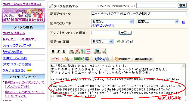 開設したブログの投稿ページで右クリックし、貼り付けを左クリックすると記事の中にソースを貼り付けられます。 投稿画面ではソースがそのまま表示されていますが、投稿ボタンを押して投稿するとバナーが表示されます。 私が使っているライブドアブログの投稿画面でやってみます。 |