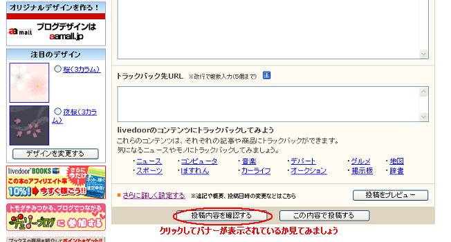 先ほどエーハチネットのログインした画面でコピーしておいたアフィリエイトソースが貼り付けられました。 記事を書く画面ではソース表示のままですが、実際にブログを投稿してみるとバナーが表示されます。 ライブドアブログでは投稿ボタンを押す前に投稿内容を確認できるボタンがあるので、クリックして確認してみます。 |